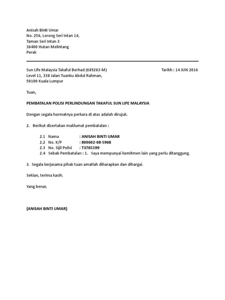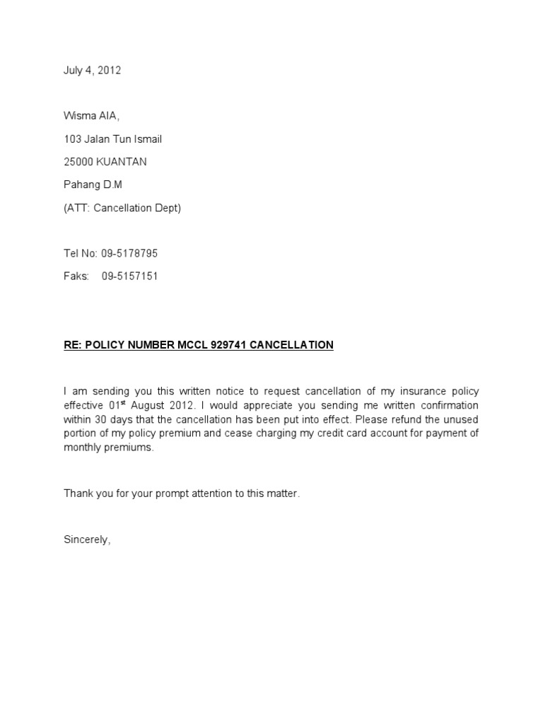 Apr 15 2022. Ini adalah contoh surat pembatalan polisi insurans yang boleh anda salin dengan sedikit perubahan.