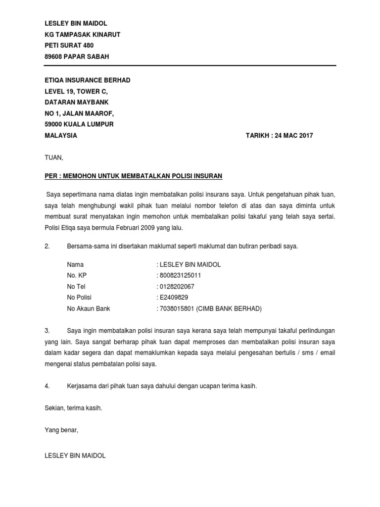Surat Pembatalan Polisi Insuran Pdf